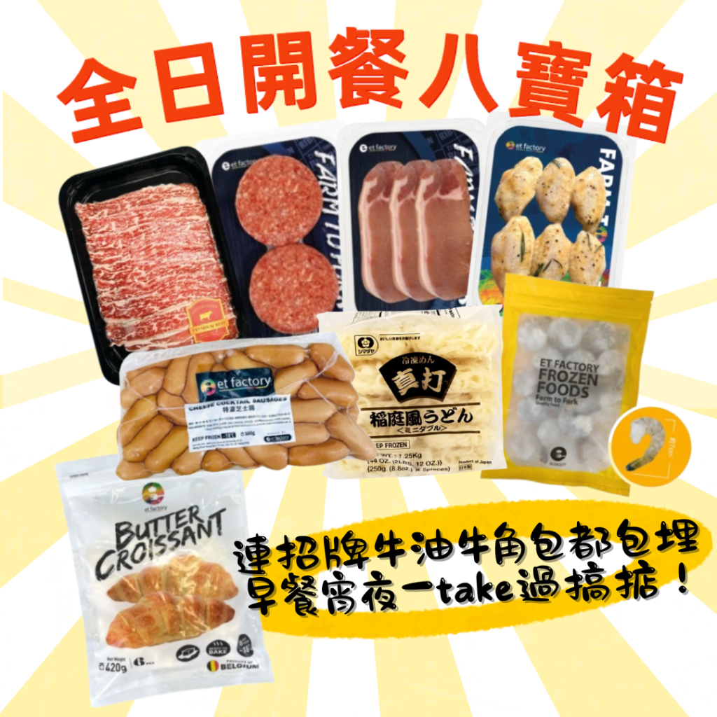 想一箱返屋企,成日都唔使煩今晚食咩?「全日開餐八寶箱」一次過幫你配好由早餐、午晚餐到宵夜都用得著既急凍好物,牛、豬、雞、蝦、腸、牛角包同烏冬全部包晒各 1 包,2–4 人家庭用最啱🫶🫶